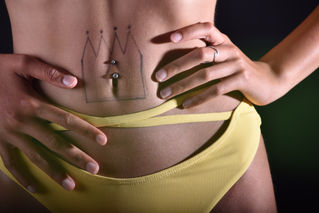 בסט זה אני מתכננת לצלם בחורה בבגד ים, בחורה רזה, עם עגיל בטבור, ומסביב לעגיל, מצויר כתר המדמה קעקוע. בגד הים יהיה בצורה אלכסונית כך שתיווצר אווירה חנוקה, מפוחדת כאילו הדמות כבולה בזרועות בן אדם אחר וגם כבולה בזרועותיה. כאמור, הכתר שם בשביל שתי סיבות. הראשונה היא פשוטו כמשמעו, הכתר מסמל את המלוכה וזוהי הקבלה למשהו קדוש כמו שבעולם היום, הפירסינגים הפכו להיות טרנד שנמשך ונהיה שכיח יותר ויותר. הסיבה השנייה היא שהכתר מדמה את הקעקועים על הגוף, הציורים שאנו בוחרים להטמיע בגופנו שגם הם חברו לתהליך הרדיפה אחרי מודל היופי. אצלם בסטודיו, על מנת שאוכל לשלוט בתאורה כך שתיווצר האווירה אליה אני רוצה להגיע.  בפריים הנ"ל אני צריכה להקפיד על תאורה נכונה ומתאימה למצב של הדמות. כלומר,לדוגמא אם הדמות אוחזת במותניה, אני רוצה להתאים תאורה שתשמש אמצעי לזעזע את הצופה. בנוסף, אצטרך לדאוג לבגד ים מתאים לדוגמנית, ולכלי כתיבה מתאים לגוף שאפשר איתו לצייר על הגוף. חשוב לי להשיג מהסט הזה את המסר שהפירסינג והקעקועים הפכו לדבר מאוד שכיח בעולם, זהו חלק מהרדיפה אחרי מודל היופי. בנוסף, ארצה להמשיך לשמור על המסר שטירוף סביב הנראות שלנו הוא דבר בלתי נגמר שבסופו כולנו מרגישים כלואים להבניות החברתיות שלו, כמו שהדמות בפריים כלואה בזרועות עצמה ובגד הים שלה.